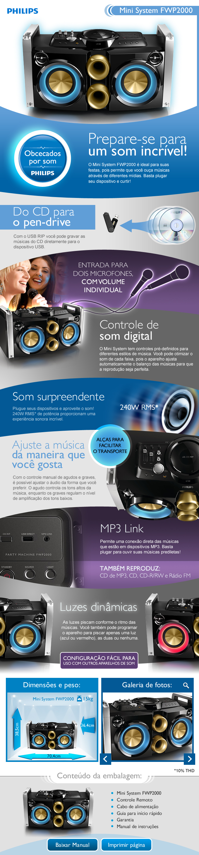 O Mini System FWP2000 é ideal para suas festas, pois permite que você ouça músicas através de diferentes mídias. Basta plugar seu dispositivo e curtir!