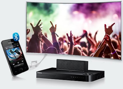 O sistema de áudio Samsung usa o Bluetooth para se conectar com os dispositivos portáteis compatíveis dispensando o uso de fios.