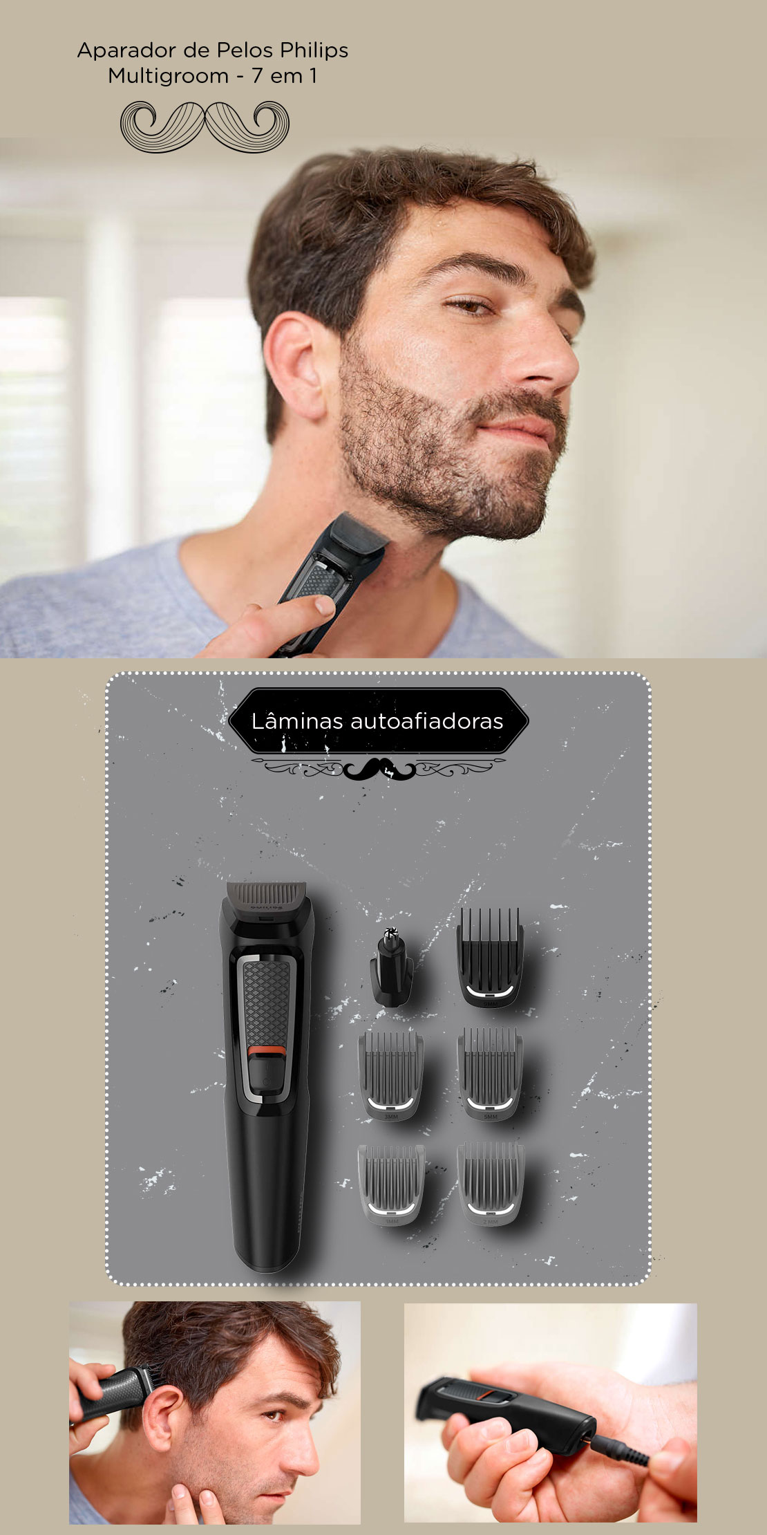 Esse modelo vem com 7 ferramentas, que o deixa bem completo. Você pode aparar e modelar sua barba, deixando no estilo que mais gosta, cortar seu cabelo para arrasar no visual e remover os pelos do nariz e das orelhas de uma forma bem simples e rápida. E para dar