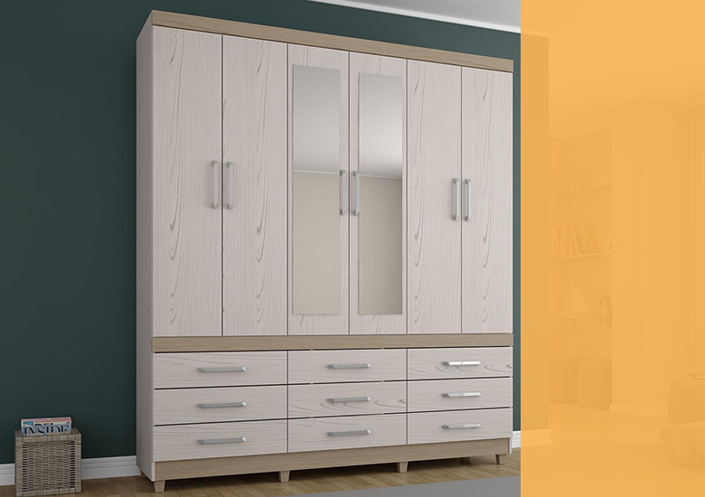 Ele tem 6 portas, cabideiro, calceiro e você pode pendurar as roupas pra mantê-las passadinhas com muita praticidade. E as 9 gavetas são ótimas, ainda mais se você não tem espaço pra colocar uma cômoda! Dá pra guardar com tranquilidade suas peças leves como meias, pijamas, roupas íntimas, acessórios, aquelas blusas de frio que você não usa sempre, documentos e muito mais.