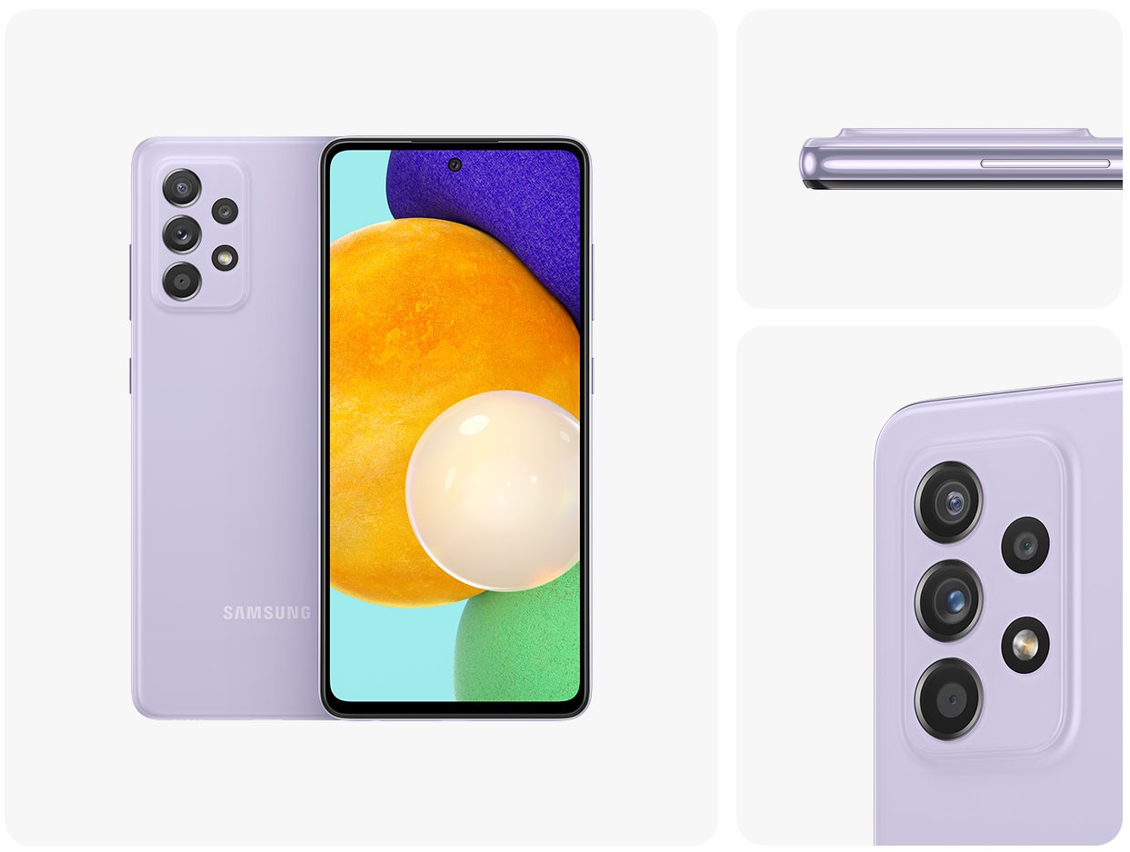 Contemple as curvas elegantes e confortáveis do design perfeito do Galaxy A52 5G. A caixa