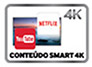 Conteúdo Smart 4k Com os aplicativos de vídeo em 4K disponíveis na sua Smart Ultra HD Samsung, você tem acesso ao Netflix, programas dos canais Globosat e centenas de videos do Youtube. Tudo isso com a melhor qualidade de imagem para você não perder nenhum detalhe.