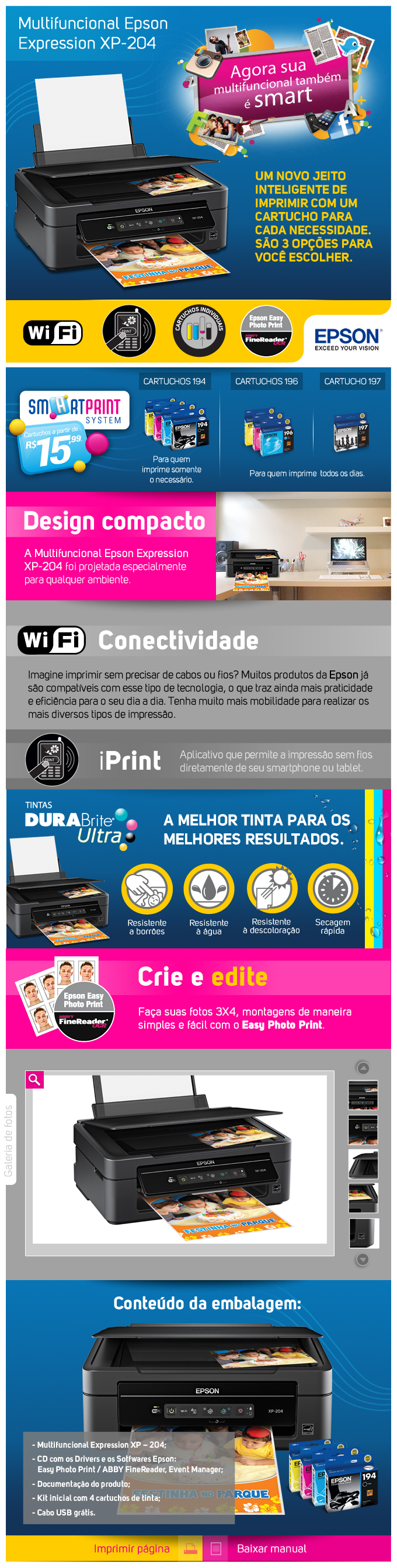 A Multifuncional Epson Expression XP-204 foi projetada especialmente para qualquer ambiente.