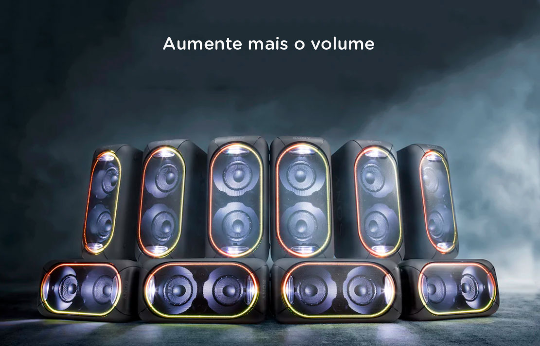 Quer aumentar ainda mais o volume? Conecte até 10 caixas de som compatíveis com Wireless Party Chain para ter ainda mais potência sonora e um show de luzes sincronizadas. E como tudo