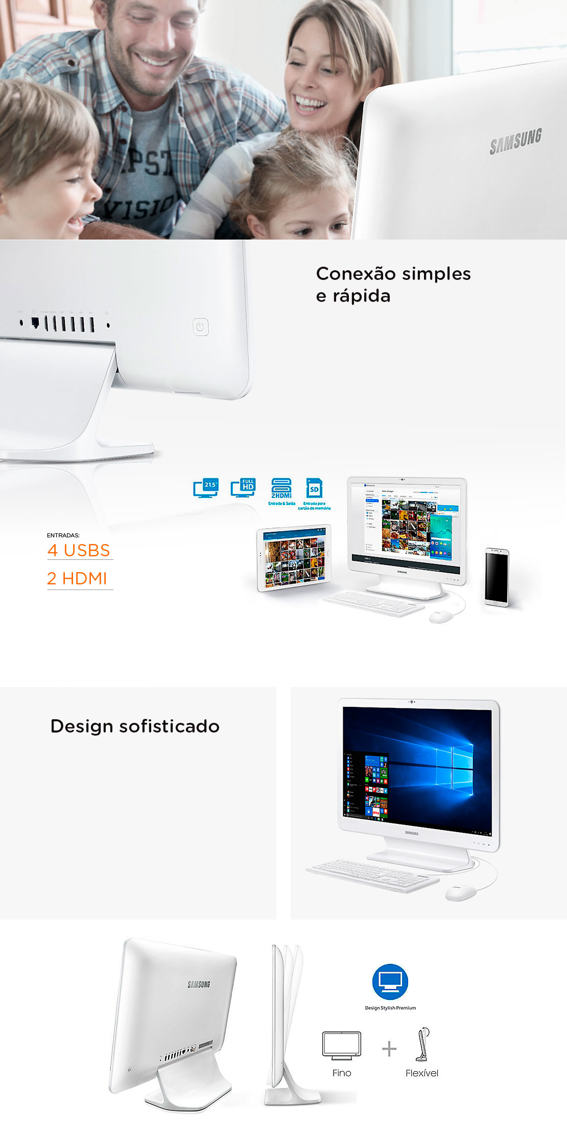 Sabe aquele monte de fios que ficam espalhados quando você monta seu computador? Com o All in One isso não acontece! Ele tem um design minimalista