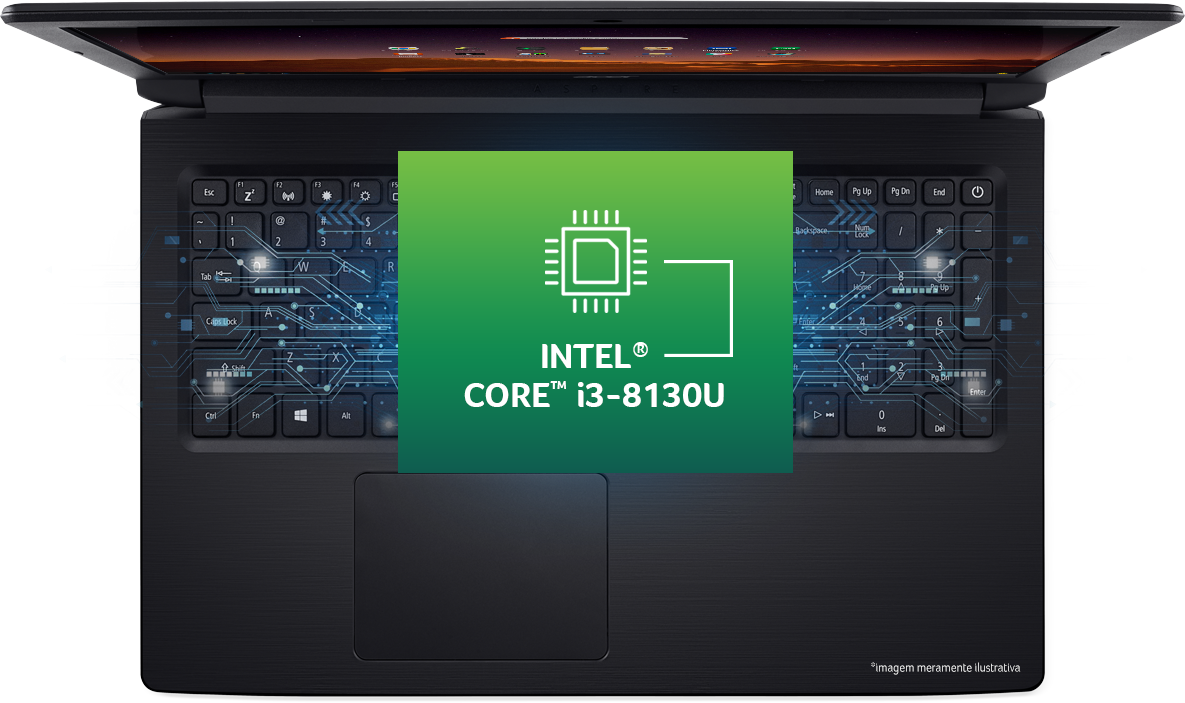 Intel® Core™ i3-8130U de 8ª geração em conjunto com os 4GB de memória RAM