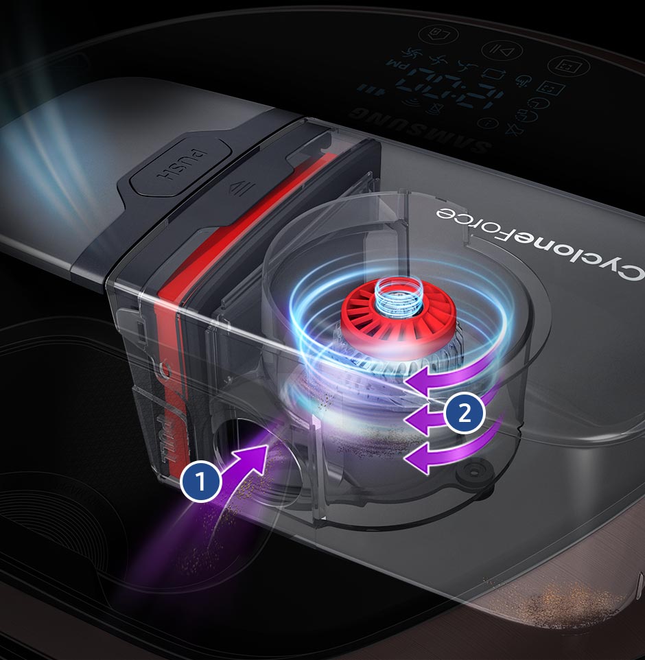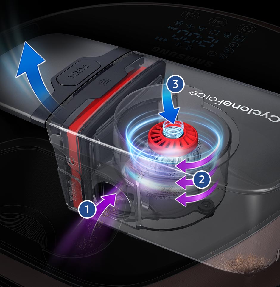 A tecnologia Cyclone Force gera uma força centrífuga que extrai a sujeira e detritos do ar para uma câmara externa, mantendo o filtro limpo por mais tempo, o que ajuda a evitar o entupimento.