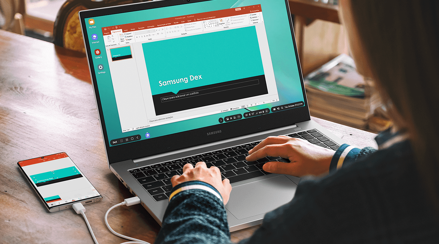 Tudo que você precisa é de um cabo USB. Usar o seu telefone é mais conveniente com um monitor grande, um teclado e um mouse. Navegue pela
