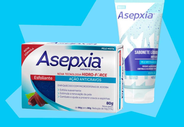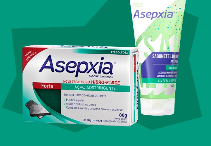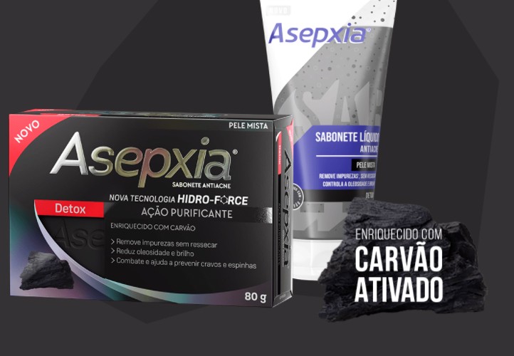 Asepxia é especialista em limpeza e na pele oleosa, e tem uma linha completa pra cuidar dela, com produtos inclusive para quando aparece aquela espinha indesejada, além de sabonetes específicos.