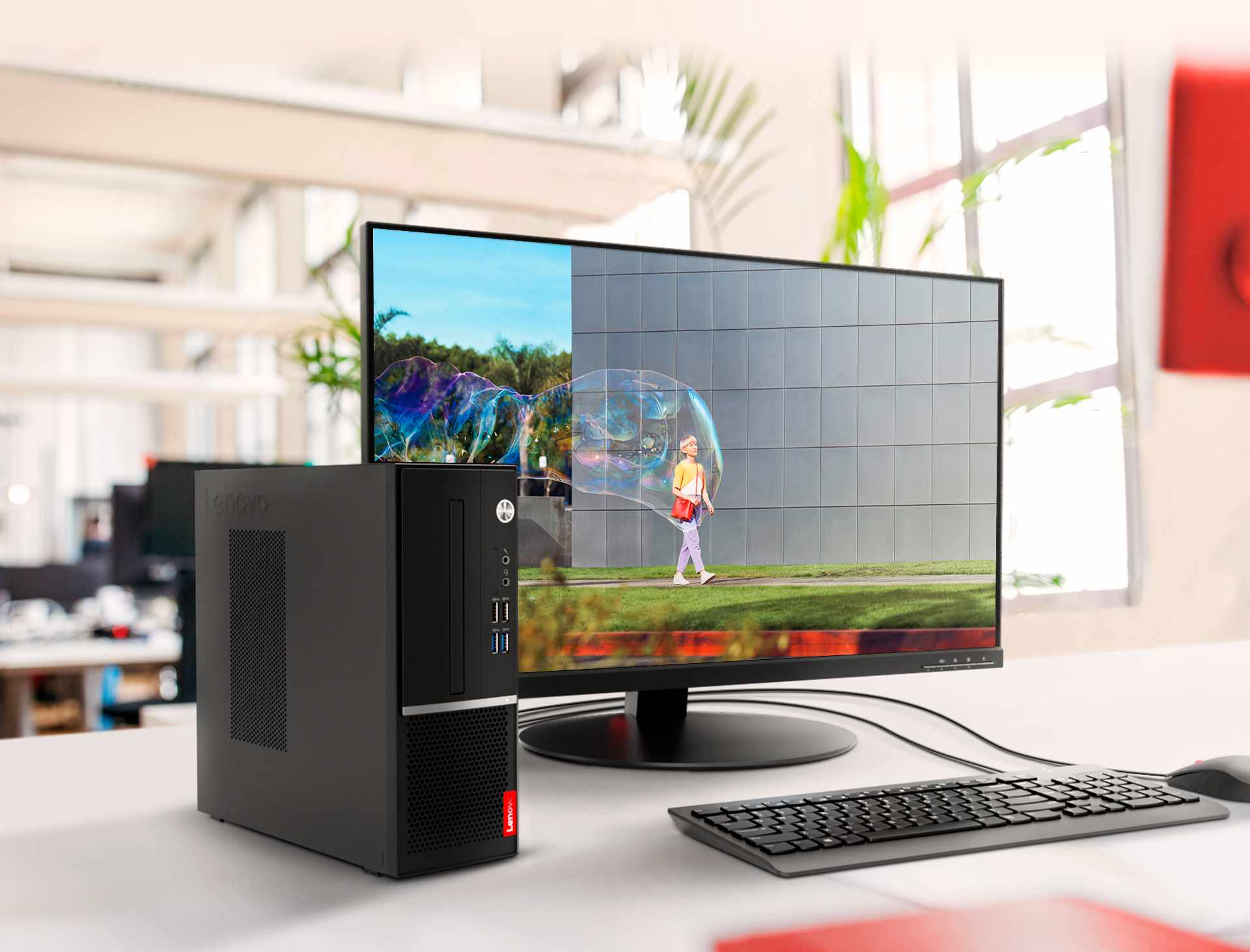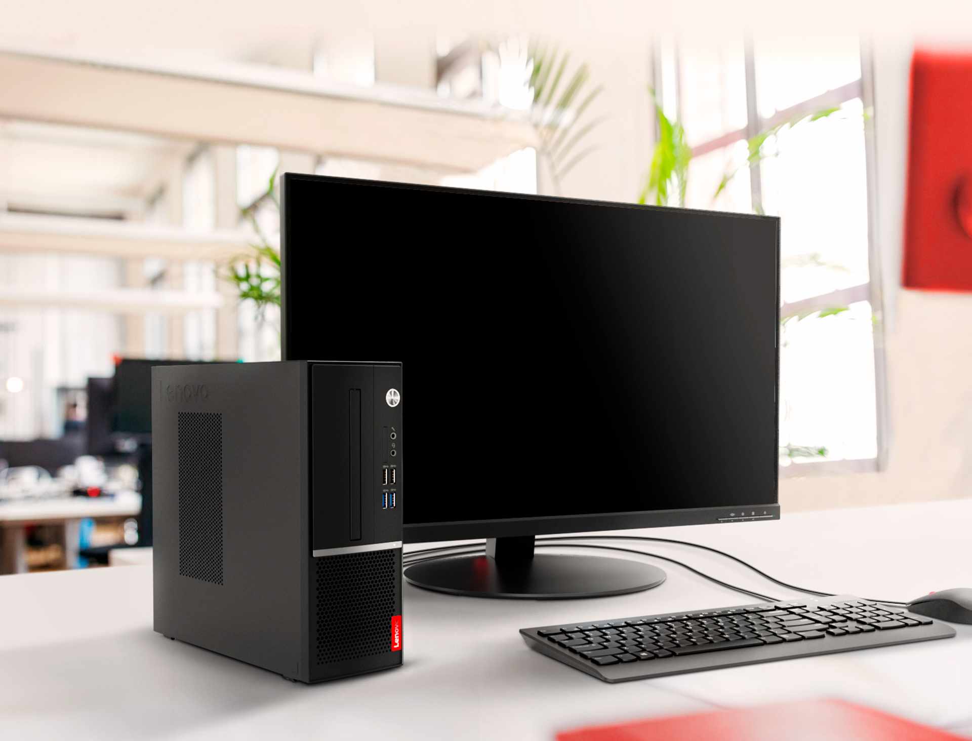O desktop V530s SFF oferece a conveniência de quatro portas USB de fácil acesso voltadas para frente que facilitam a conexão de periféricos e seu chassi de 7,4L, cabe praticamente em qualquer lugar do escritório ou home office.