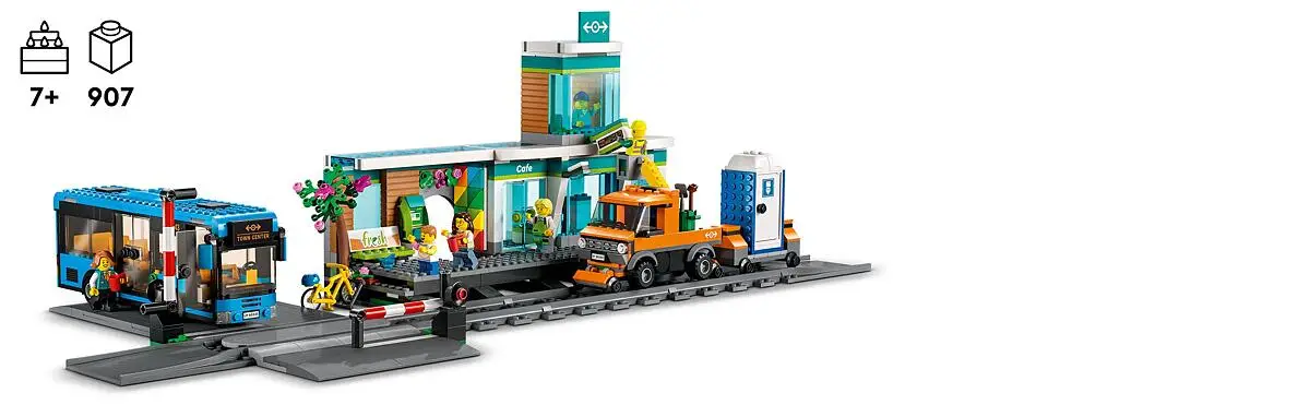 Inclui um terminal de trem de dois andares, plataforma, ônibus, caminhão, banheiro químico, passagem de nível e 6 minifiguras