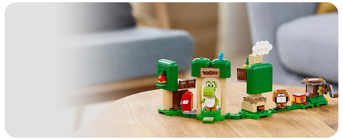 Visite a Casa dos Presentes de Yoshi (71406) para colher, “comer” e distribuir frutas, girar o carrossel de presentes para deixar as frutas ainda mais saborosas, tirar um cochilo e muito mais.