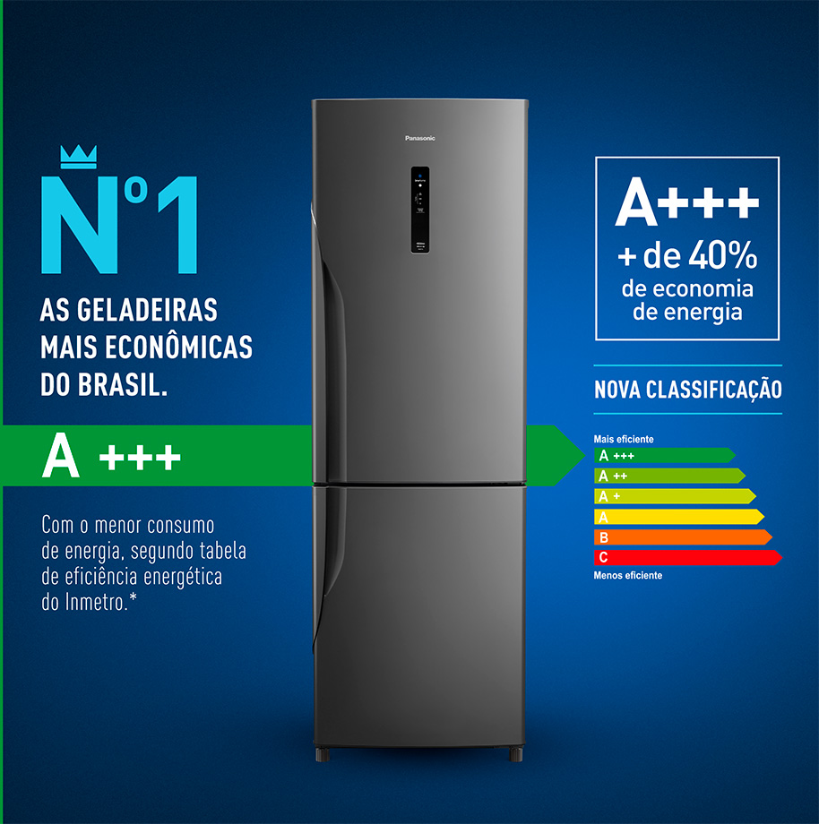 As geladeiras Panasonic possuem a classificação A+++ na tabela de eficiência do Inmetro, economizando mais de 40%² na conta de luz. Com tecnologia Inverter, elas são também mais silenciosas e congelam mais rápido.