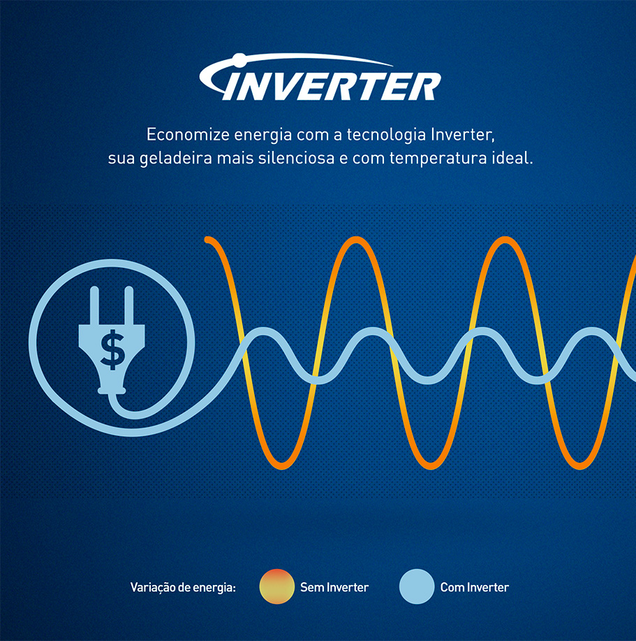 Além de economizar até 40% energia, o sistema Inverter deixa sua geladeira mais silenciosa e com congelamento de alimentos mais rápido. A tecnologia regula o compressor de acordo com a temperatura que varia com o abre e fecha da porta e com a quantidade de comida.
