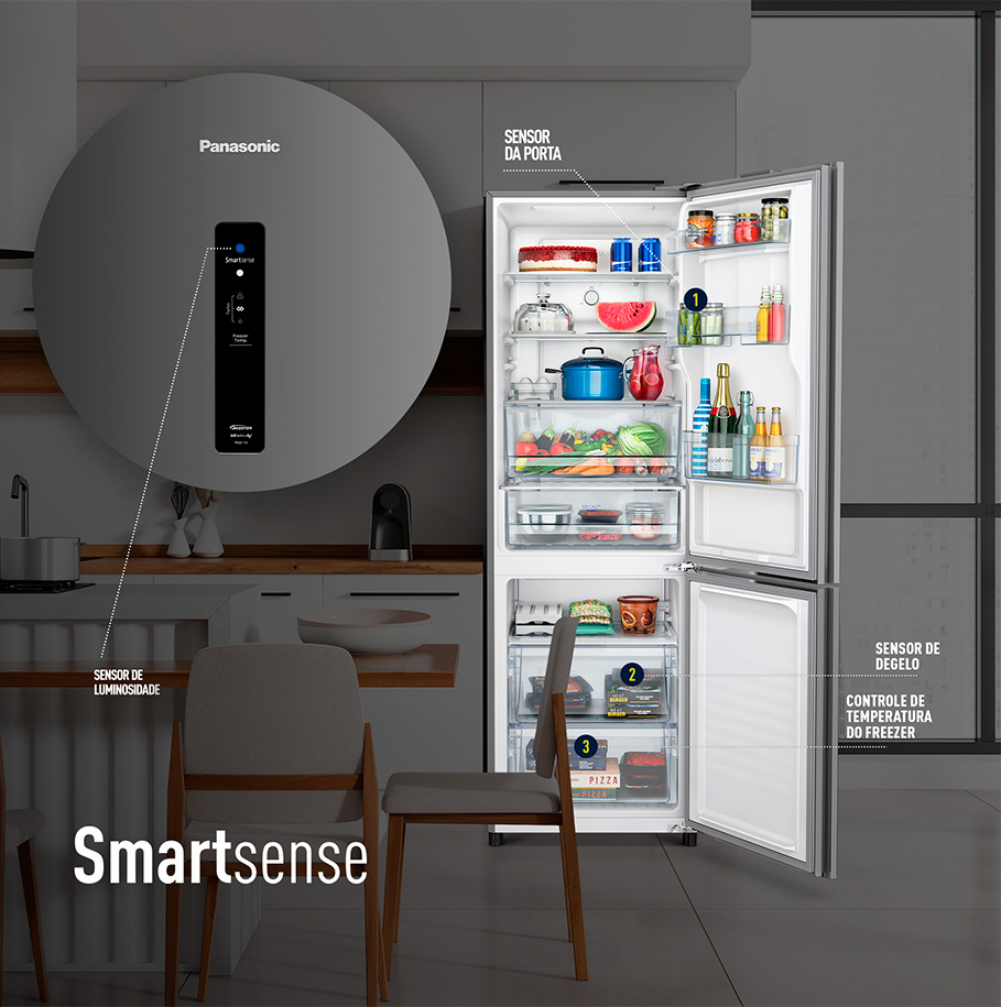 Economize ainda mais energia. O Smartsense monitora o uso da geladeira no seu dia a dia, fazendo com que ela funcione de acordo com a rotina da casa e economizando energia através de sensores de abertura de portas, luminosidade e temperatura (interna e externa).