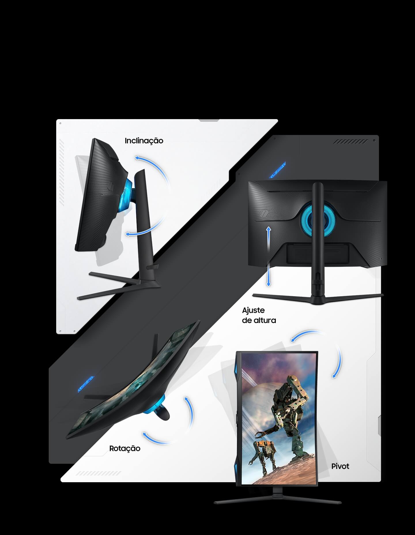 Encontre sua posição vencedora. Gire, incline e ajuste a altura até que você esteja preparado para a vitória. Totalmente compatível com os suportes de monitor padrão VESA, a tela pode ser movida sem esforço para sua posição ideal.