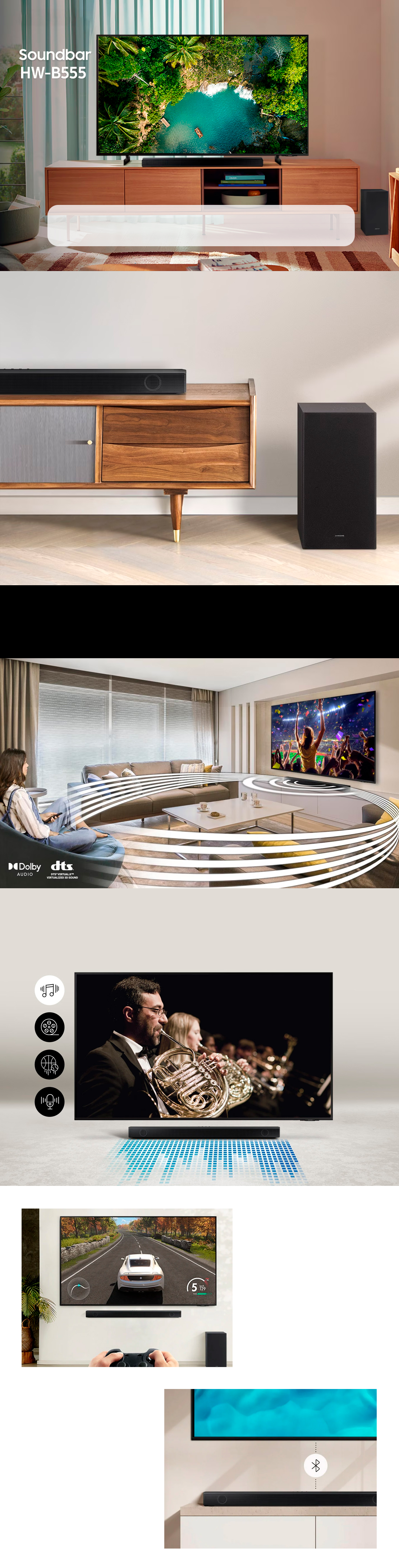 Ah, e ele também vem com conexão bluetooth, entradas HDMI, Óptica e USB pra você conectar vários dispositivos e aproveitar seus conteúdos favoritos