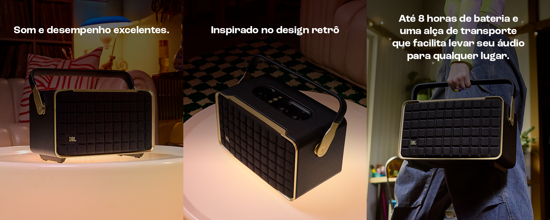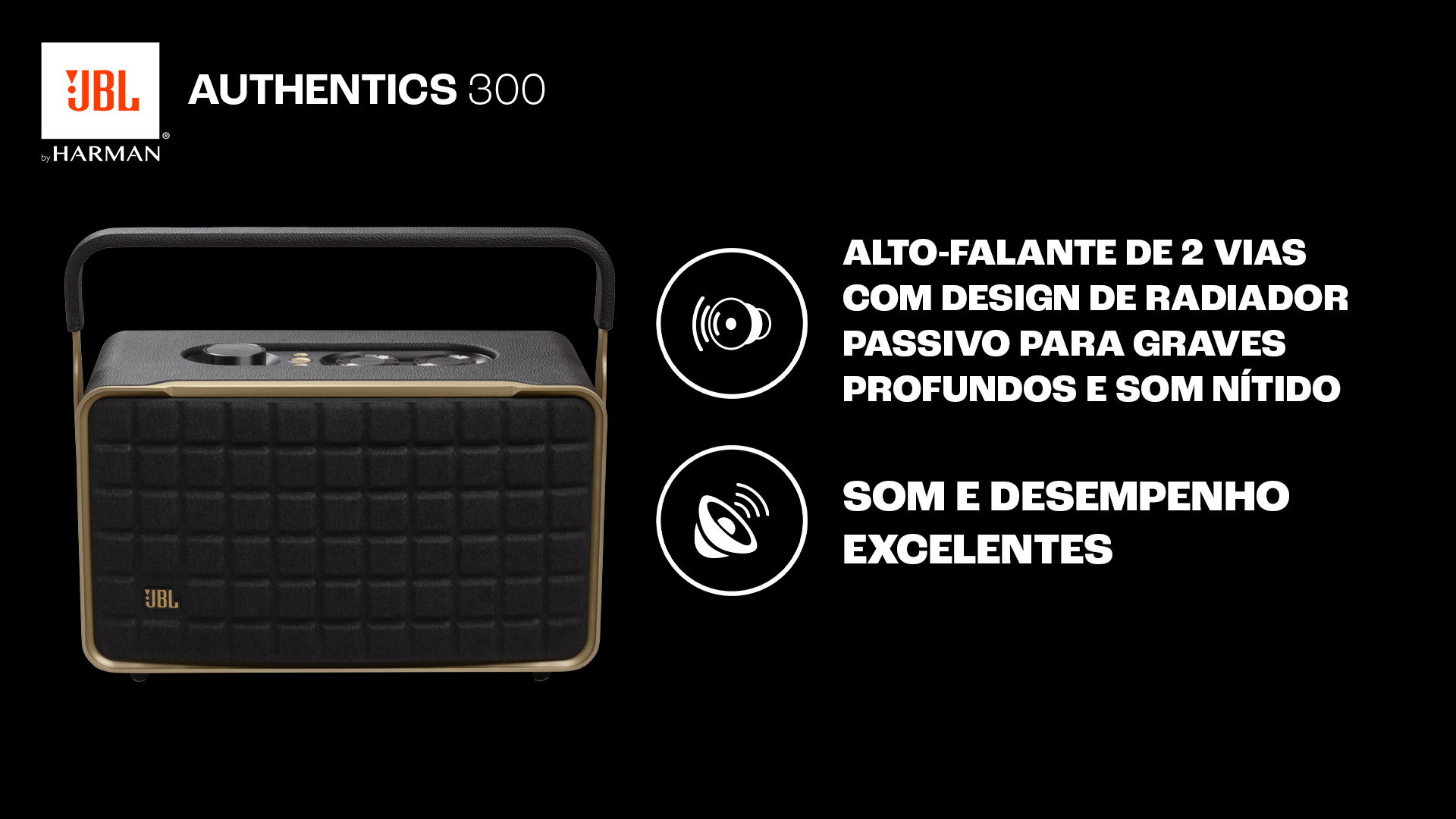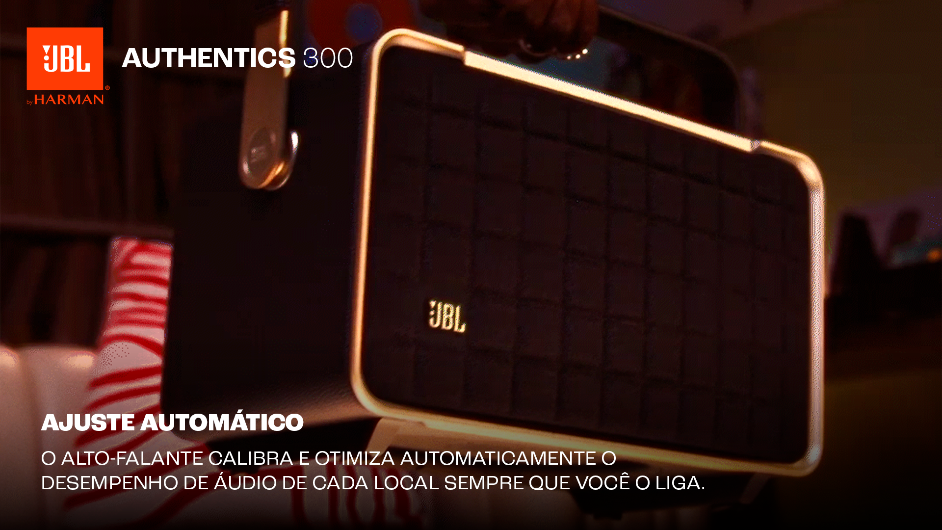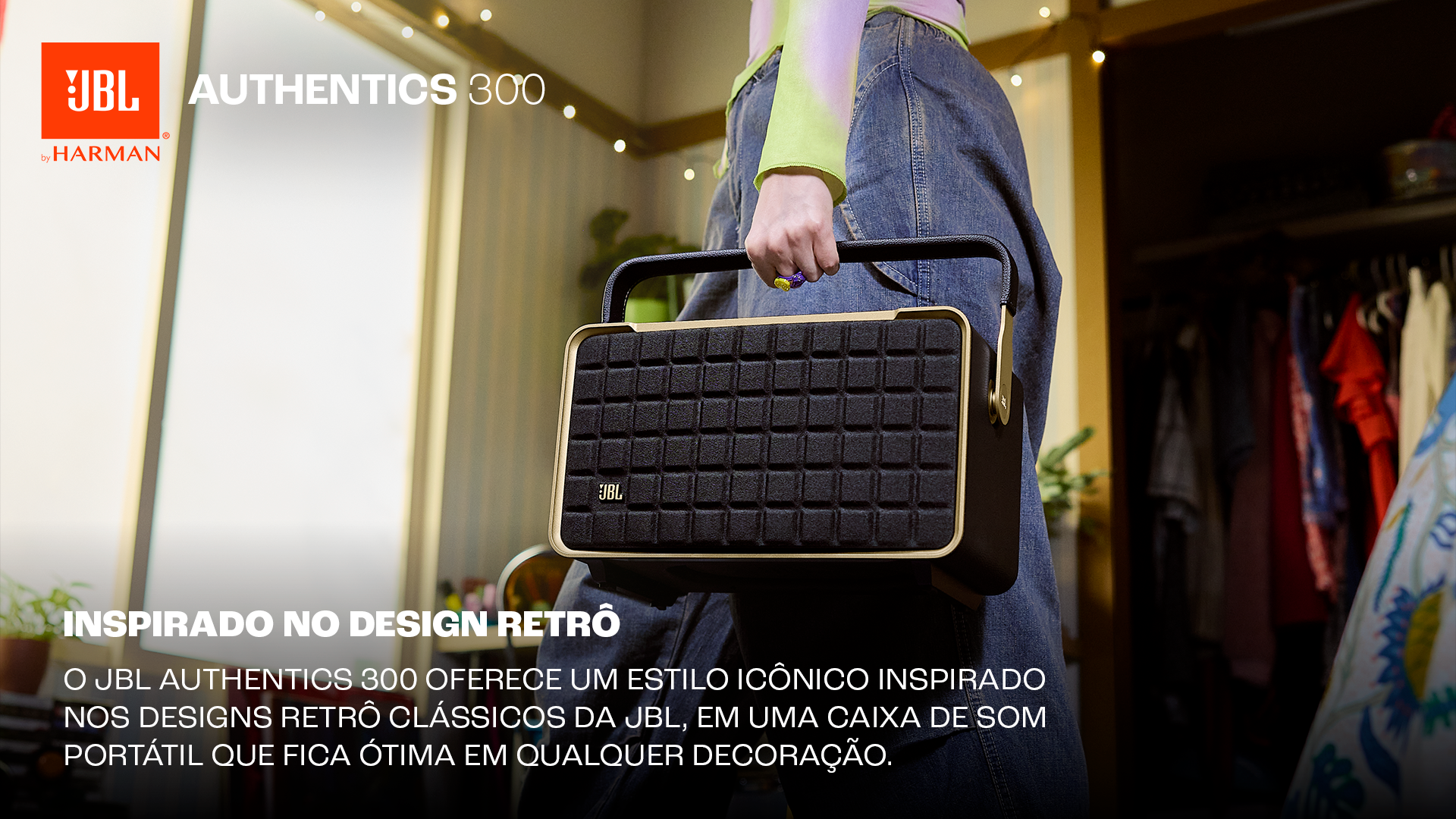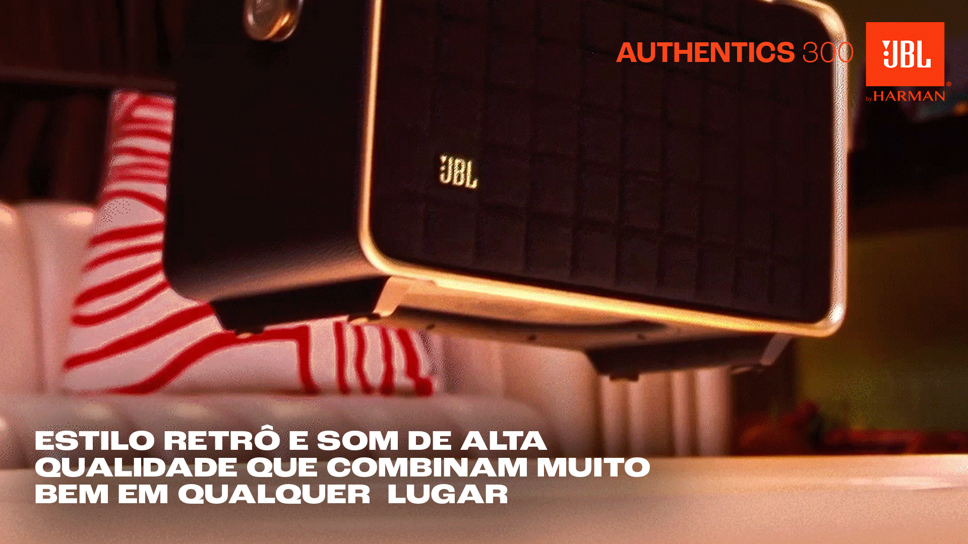 O JBL Authentics 300 oferece um estilo icônico inspirado nos designs retrô clássicos da JBL, em uma caixa de som portátil doméstica com agudos cristalinos e graves profundos que fica ótima em qualquer decoração.