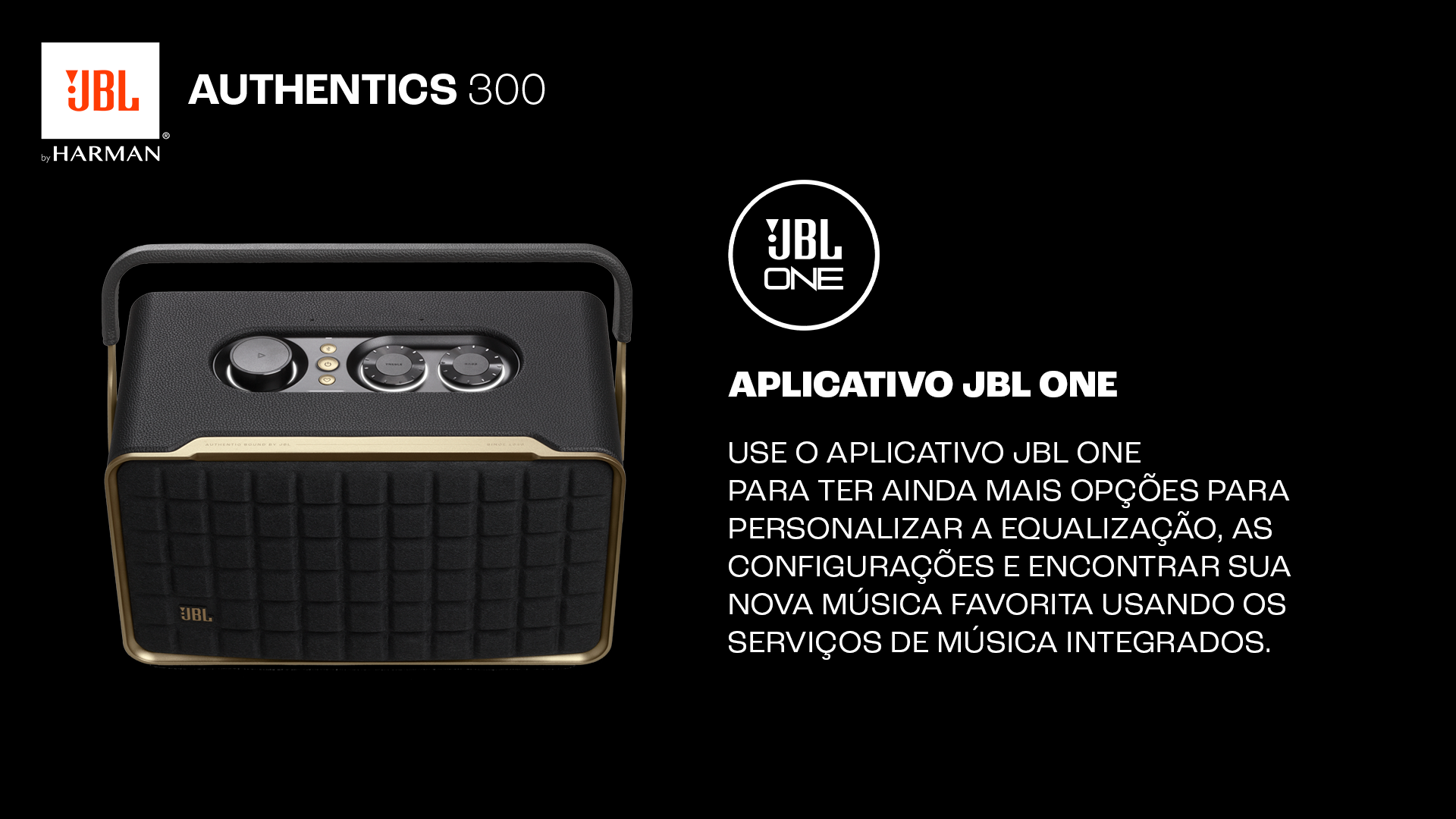 Use o aplicativo JBL One para ter ainda mais opções para personalizar a equalização, as configurações e encontrar sua nova música favorita, usando os serviços de música integrados.