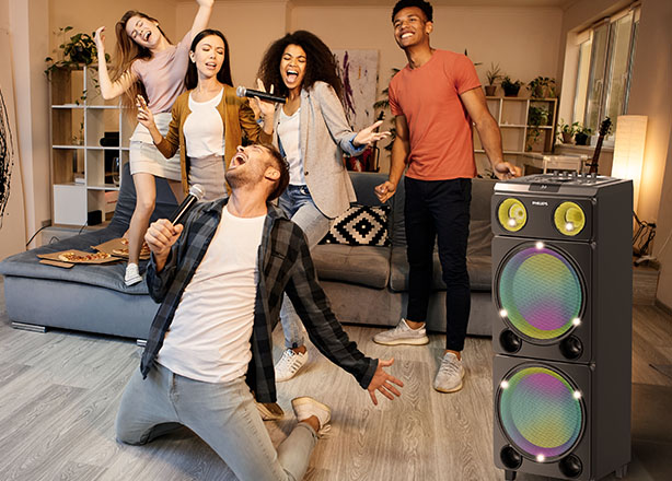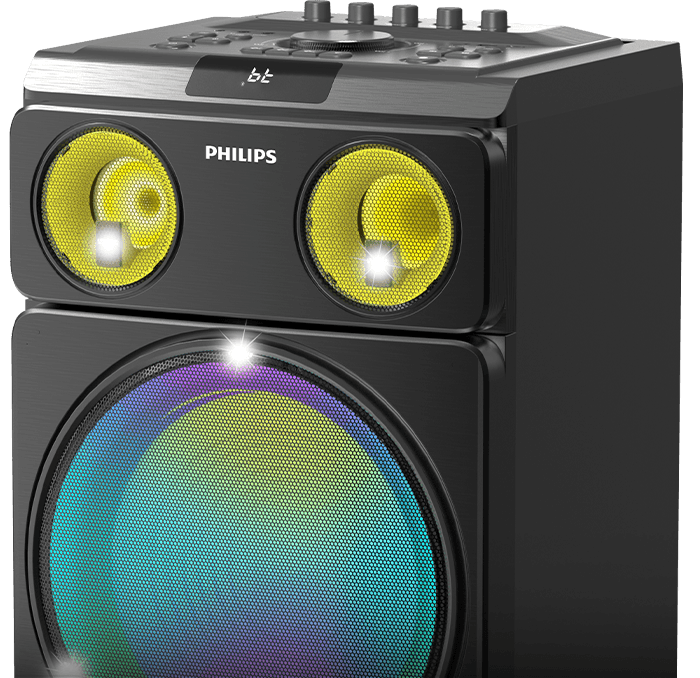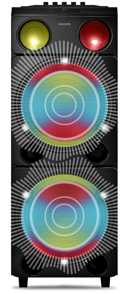 de festa ainda mais envolvente.Ilumine seu espaço e vibre com a música! Quando as músicas estão tocando, um arco-íris de luzes coloridas brilha e pulsa na superfície dos woofers, do driver e do tweeter. Com nove modos de luz para escolher, você pode criar um show de luzes único.