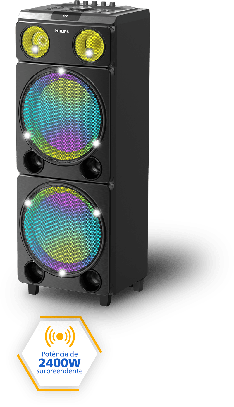 e guitarra permitem que você seja a estrela do momento.Com 2400W de potência, a caixa de som preenche o ambiente com suas batidas! Possui 2 woofers de 12",