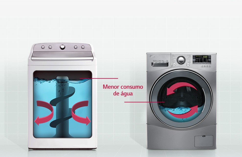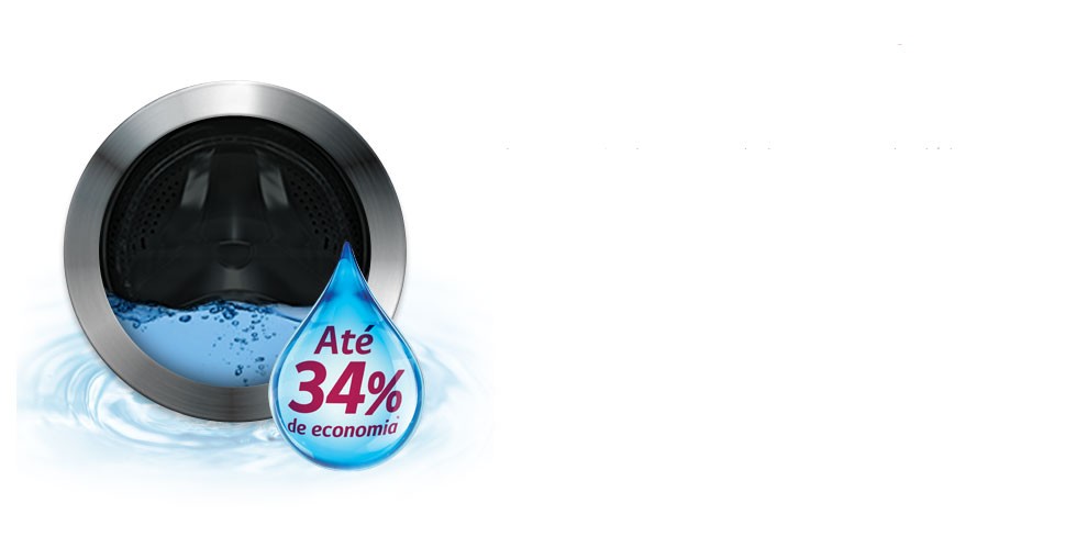 A comparação de consumo de água entre top load (abertura em cima) x front load (abertura frontal) da LG representa economia de até 34%* de água (modelos de 10,4kg): ou 46 litros a cada lavagem. Faça as contas: se uma família média lava roupas pelo menos três vezes por semana, haverá economia semanal de 138 litros de água. No mês são 550 litros de água = uma caixa d’água. Isso porque o sistema de lavagem da front load não exige que se encha o tambor. Além disso, a lava e seca possui o sensor de carga que calcula o quanto de água será necessário na lavagem, podendo economizar ainda mais.