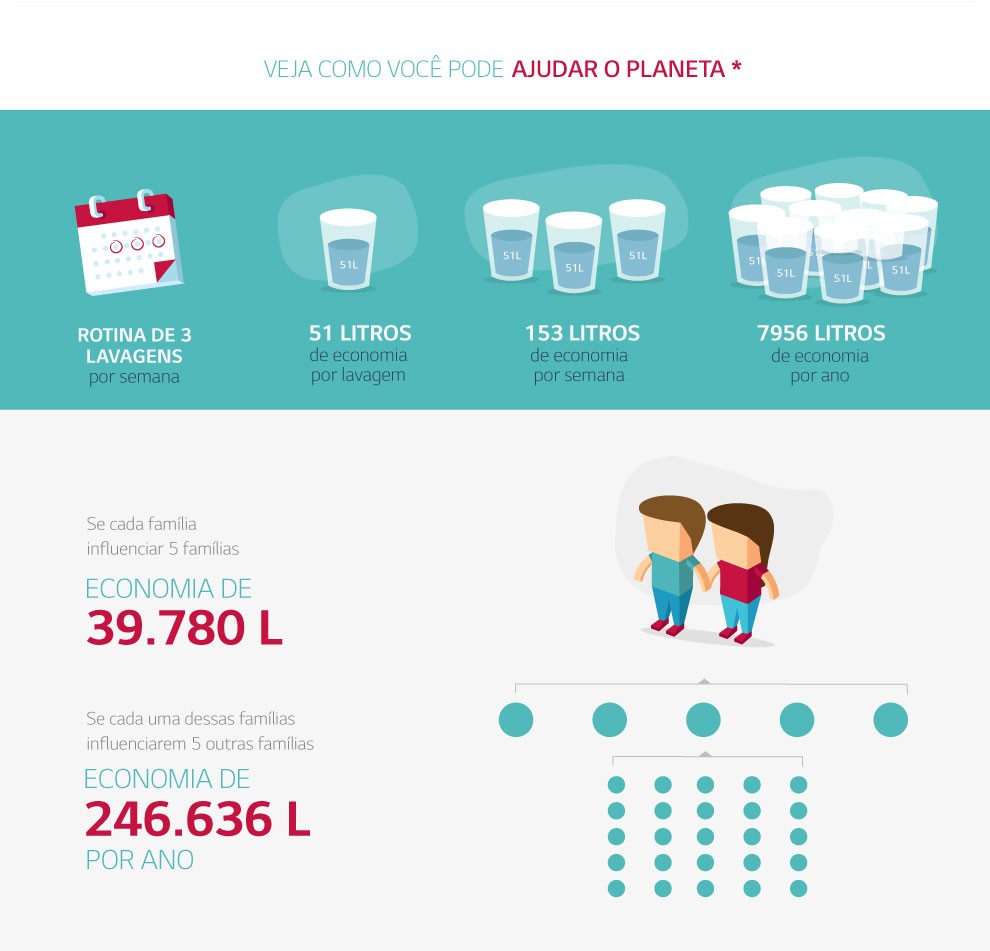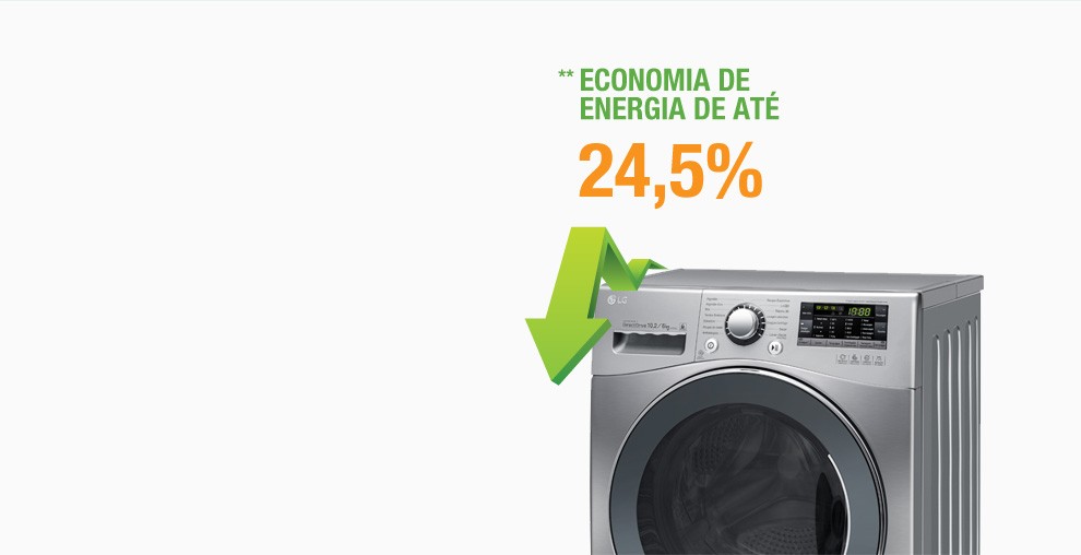 *Cálculo baseado conforme índices divulgados pelo Inmetro, em 15/04/2014 na edição 122, comparando modelos de capacidade semelhantes com abertura superior, voltagens iguais e demais especificações técnicas similares. **Cálculo baseado na tabela Inmetro (Edição 133 de 01/04/2015), comparando modelos de capacidade semelhantes, voltagens iguais e demais especificações técnicas similares. Consumo de energia (kWh/ciclo) em lavagem com água fria. ***O uso da marca WWF-Brasil não implica o endosso de qualquer produto, serviço ou atividade da LG.A parceria entre a LG e WWF-Brasil abrange apenas as informações sobre economia de água.