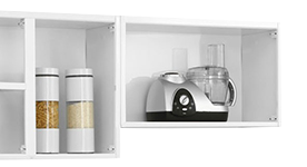 O balcão tem 2 portas pra guardar ainda mais coisas, e como ele tem prateleira, você pode organizar de um jeito fácil o que fica na parte de cima, e o que vai pra parte de baixo.