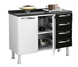 A parte de baixo tem 2 portas e cabe direitinho as panelas, travessas e o que mais precisar. Coloque pequenos eletroportáteis no tampo e ganhe ainda mais espaço.