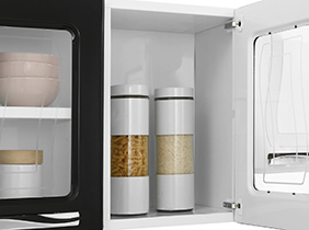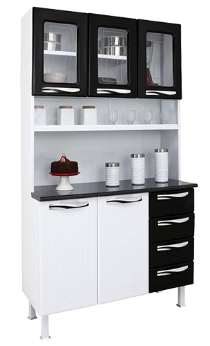 As portas tem detalhes em vidro, que além de um charme no visual, deixam mais fácil de ver tudo que está guardado. Você pode arrumar os pratos, copos, canecas ou alguma louça bonita que queira mostrar. Legal, né?